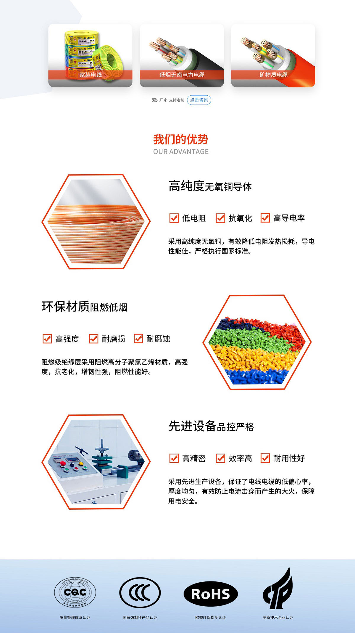公司擁有國(guó)內(nèi)一流的電線電纜生產(chǎn)和檢測(cè)設(shè)備,以科學(xué)的經(jīng)營(yíng)管理理念,引進(jìn)高級(jí)專業(yè)技術(shù)及管理人才,組建實(shí)力雄厚的技術(shù)研發(fā)和企業(yè)管理團(tuán)隊(duì),建立高標(biāo)準(zhǔn)質(zhì)量管理體系,對(duì)生產(chǎn)全過(guò)程實(shí)現(xiàn)智能化數(shù)字化管理。公司是國(guó)家高新技術(shù)企業(yè)、國(guó)家級(jí)專精特新“小巨人”企業(yè)、CNAS國(guó)家重點(diǎn)實(shí)驗(yàn)室、湖南省企業(yè)技術(shù)中心、長(zhǎng)沙市技術(shù)中心、湖南省新材料企業(yè)、湖南省綠色制造體系示范單位(綠色工廠)、湖南省制造業(yè)品牌培育試點(diǎn)企業(yè)、湖南省產(chǎn)融合作制造業(yè)重點(diǎn)企業(yè)、湖南省守合同重信用企業(yè)、長(zhǎng)沙市專精特新小巨人企業(yè)、長(zhǎng)沙市技術(shù)創(chuàng)新中心(產(chǎn)業(yè)引導(dǎo)類)、湖南省制造業(yè)品牌培育示范企業(yè)、瀏陽(yáng)市誠(chéng)信企業(yè),先后通過(guò)國(guó)家強(qiáng)制性產(chǎn)品認(rèn)證(CCC認(rèn)證),全國(guó)工業(yè)生產(chǎn)許可證,歐盟CE認(rèn)證、質(zhì)量管理體系認(rèn)證(ISO9001)、中國(guó)職業(yè)健康安全管理體系認(rèn)證(ISO45001)、環(huán)境管理體系認(rèn)證(ISO14001)、知識(shí)產(chǎn)權(quán)管理體系認(rèn)證、武器裝備質(zhì)量管理體系認(rèn)證、IATF16949:2016質(zhì)量管理體系認(rèn)證、歐盟環(huán)保體系認(rèn)證、礦用產(chǎn)品安全認(rèn)證、能源管理體系認(rèn)證,并榮獲CCTV《品牌中國(guó)》重點(diǎn)推薦品牌、品牌強(qiáng)國(guó)國(guó)貨之光、中國(guó)電纜行業(yè)十大品牌、工程建設(shè)推薦產(chǎn)品、質(zhì)量檢驗(yàn)國(guó)家標(biāo)準(zhǔn)合格產(chǎn)品、綠色環(huán)保產(chǎn)品、湖南省知名品牌、AAA企業(yè)等系列榮譽(yù),得到業(yè)界的廣泛認(rèn)可與贊譽(yù)。