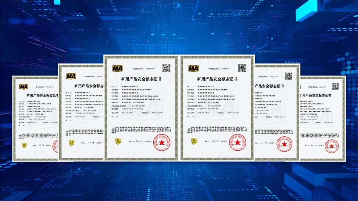 5月,湖南湘聯電纜有限公司成功取得安標國家礦用產品安全標志中心頒發MVV-0.6/1(1.5~300)mm2煤礦用聚氯乙烯絕緣聚氯乙烯護套電力電纜、MYJV-8.7/10(25~300)mm2煤礦用交聯聚乙烯絕緣聚氯乙烯護套電力電纜等六個產品的礦用產品安全標志證書。