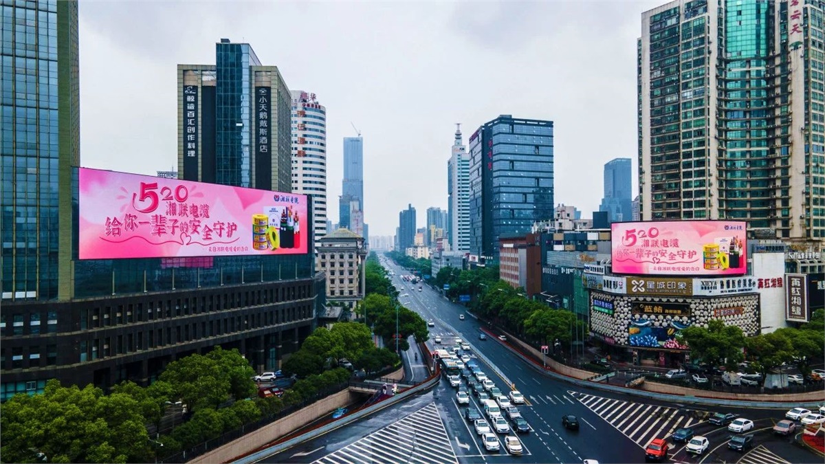 5月20日,湘聯電纜聯動長沙多塊大屏,全城告白,向每一位用戶傳遞溫暖守護的決心。粉色系的畫面,搭配安全感滿滿的文案。湘聯電纜將守護的心意,藏進星城的大街小巷,為每一位關注、選擇、信任湘聯電纜的用戶送上一份驚喜告白。